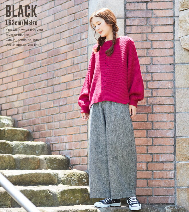 SIZE GUIDE −サイズガイドー S M ベルト幅 約5cm 約5cm ウエスト 約70cm 約74cm ヒップ 約109cm 約113cm わたり 約36.7cm 約38cm ひざ幅 約34.4cm 約35.4cm 裾幅 約31cm 約32cm 股上 約25.3cm 約26cm 股下 約65cm 約65cm 素材 表地: ポリエステル61%, アクリル24%, ウール6%, レーヨン6%, ナイロン3% 裏地: ポリエステル100% カラー ブラック 生産国 中国 備考 ※モニター・環境等により実際の商品と多少色味が異なって表示される場合がございます。