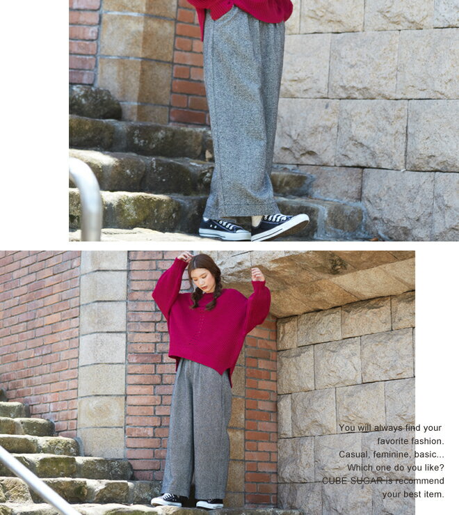 12/4 20:00start 楽天スーパーSALE【20%OFF】CUBE SUGAR ウール混先染め ツイード ワイドタックパンツ (1色)(S/M): レディース キューブシュガー いろいろサイズ ガウチョパンツ フレアパンツ【PL】